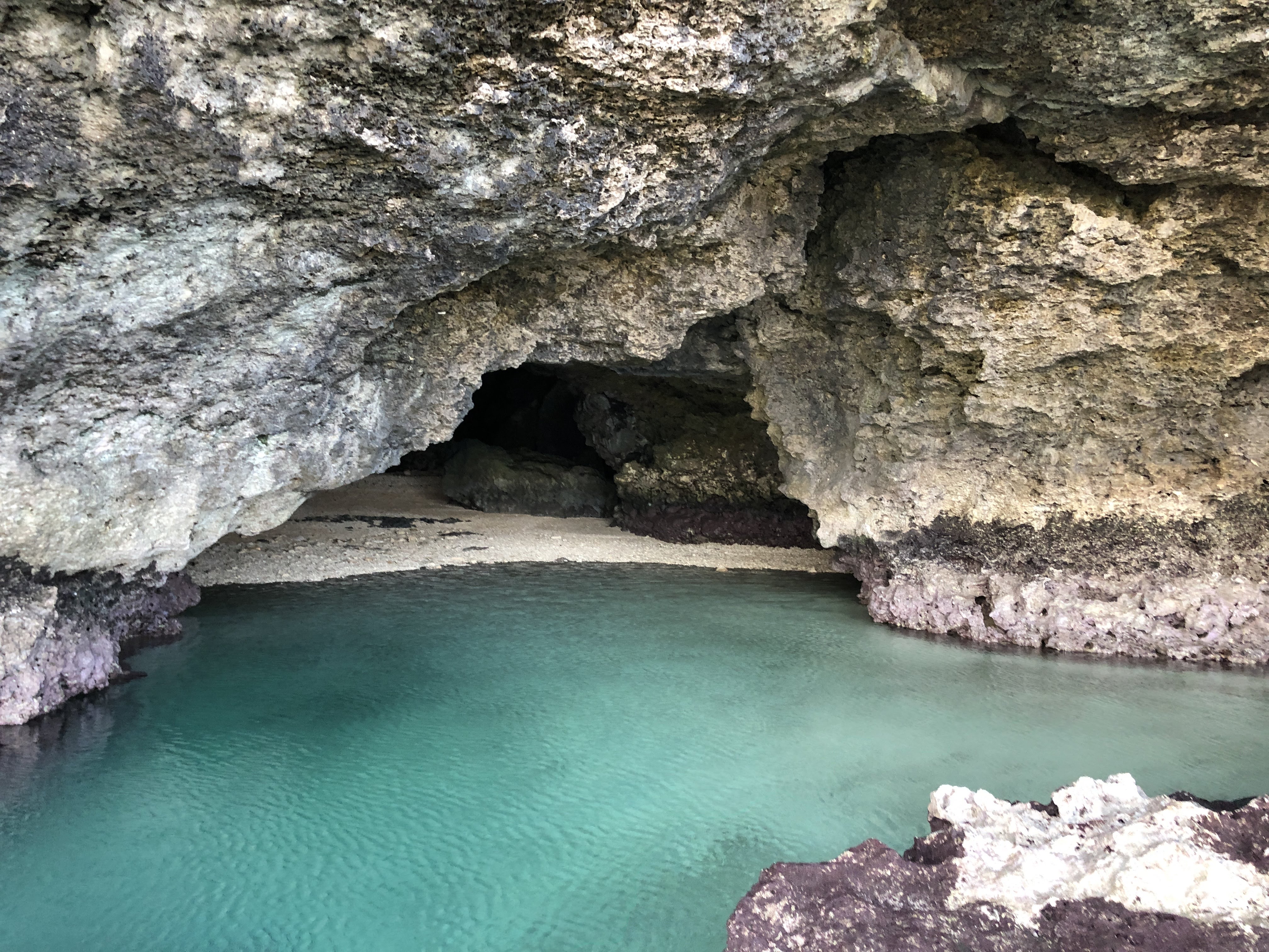 14:30 We returned the inns. After taking a short break, we went to “Blue Cave,” which was written in the inn’s information. The beach was located within 5 minutes by a car. Fortunately, it was low tide so we could walk on the shoals and reach the mouth of the cave.