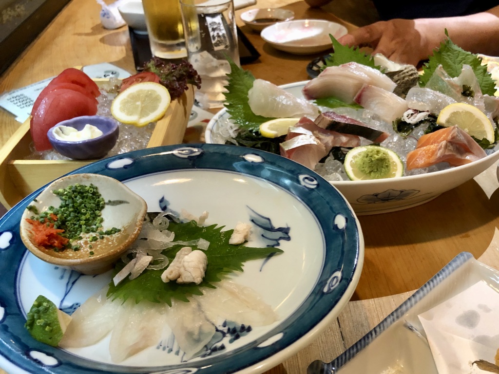 We had inexpensive Fugu and other sashimi and drank cold beer. It was superb!
