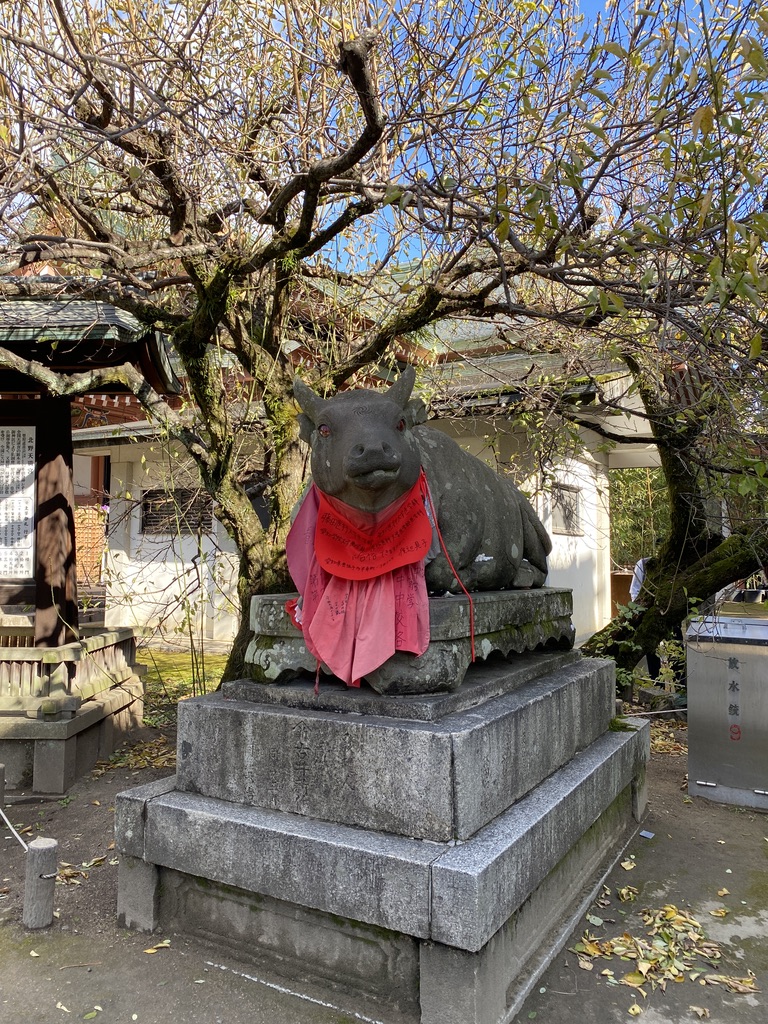 Ox is the messenger of the God in Tenmangu shrine because Michizane wished for an ox to pull the cart of his coffin and his body would be buried where the ox stopped.