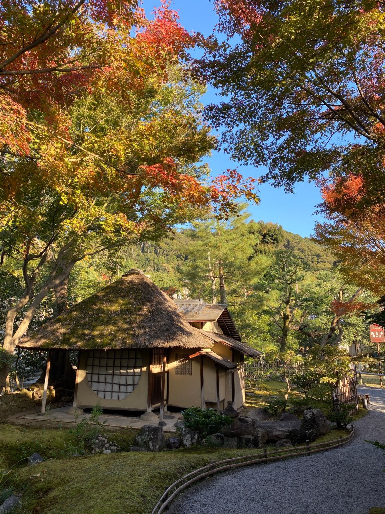 The karakasa-tei 傘亭 lit, umbrella house was designed by Sen-no-rikyu 千利休, one of the founders of Japanese “Way of Tea”, and the tea house is said to be moved from Fushimi castle 伏見城.