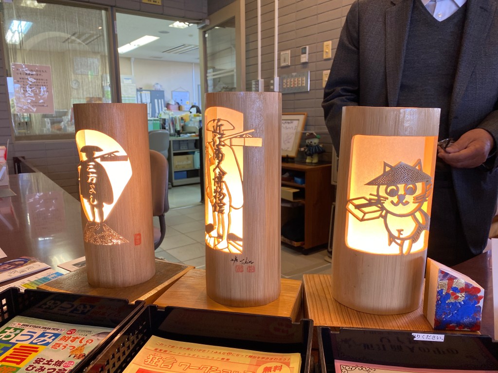 I love these bamboo lanterns, especially one with a carving of a cat wearing traditional traveling cloth, which was a typical traveling style of Omi-Shonin. They walked all over Japan carrying products on a pole.